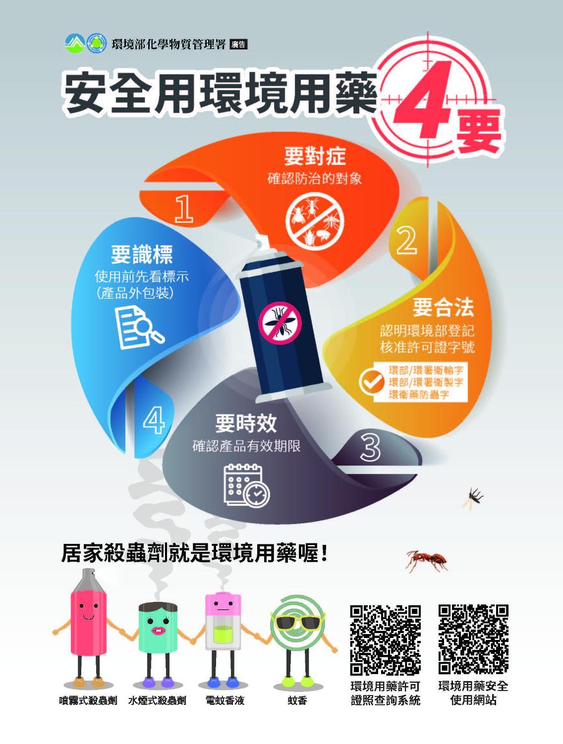 環境部表示,環境衛生以清潔整理整頓手段為優先,以預防環境衛生害蟲孳生,若發現環境衛生害蟲,需使用環境用藥時,可以依循安全用藥「4要」口訣:「1要對症」,殺菌、消毒必須選擇具有該效果的環境衛生用藥;「2要合法」,認明產品外包裝上有環境部核准「環部/署衛製字」或「環部/署衛輸字」許可證字號;「3要時效」,確認產品外包裝上的製造日期及有效期限,避免買到過期劣藥;「4要識標」,依標示(產品外包裝)正確使用,才能安全又有效。