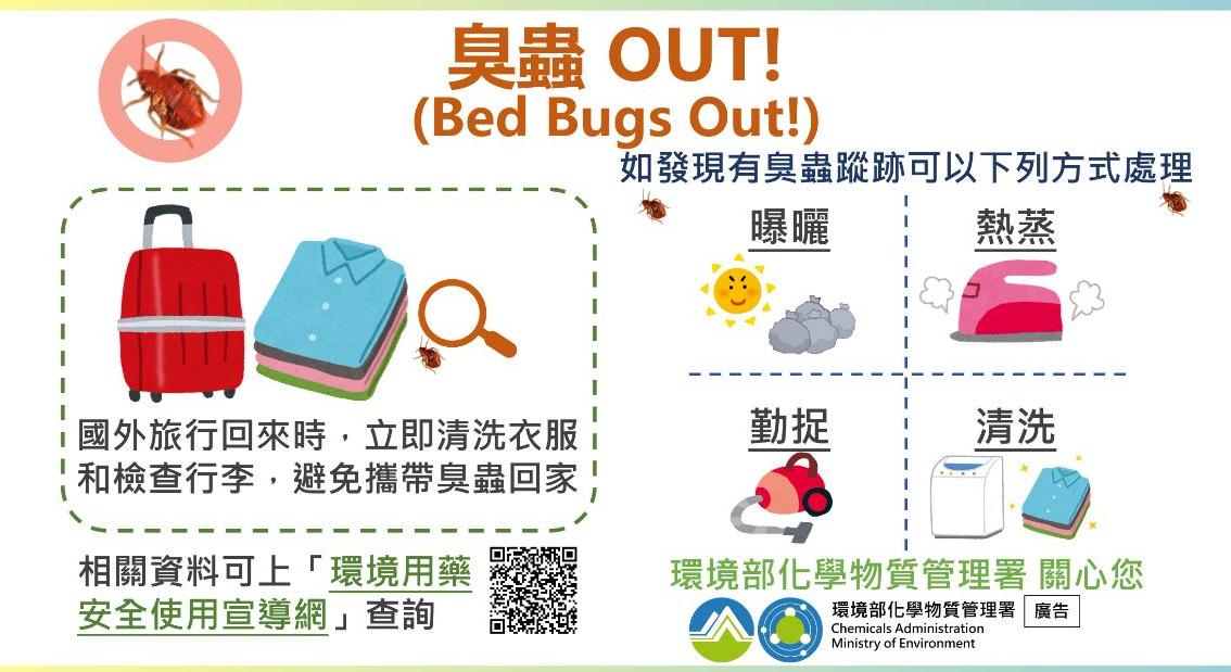 環境部也提醒民眾,自國外旅遊回來後,立即清洗衣服及檢查行李,避免攜帶臭蟲回家。若發現臭蟲,也別驚慌,勤檢查衣服行李家俱細縫,運用「曝曬、熱蒸、勤捉、清洗」清除臭蟲四妙招,最後手段才使用環境用藥殺蟲劑。如果行李箱發現臭蟲,可裝入塑膠袋中並綁緊進行曝曬,袋中溫度超過65℃可防治臭蟲,懷疑有臭蟲的衣物,則可集中裝入塑膠袋中綁緊,避免臭蟲逃逸,然後拿到洗衣機清洗,也可使用熱蒸汽熨斗進行蒸汽防治,另外吸塵器也是好用的工具,可以吸取捕捉,有效防治臭蟲,如果情形嚴重時,再選用合格環境用藥或病媒防治除蟲公司代為處理。