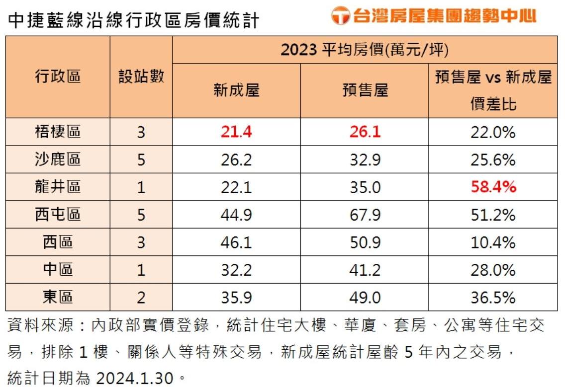 預售屋部分,同樣是梧棲最平價,2023年均價26.1萬元,為藍線唯一能以2字頭買新案的地區,西屯區則以67.9萬元,居沿線各區的預售屋單價王。而龍井去年預售屋均價35萬元,足足比新成屋高出近6成,是沿線七區當中,新成屋與預售屋價差最大的區域。