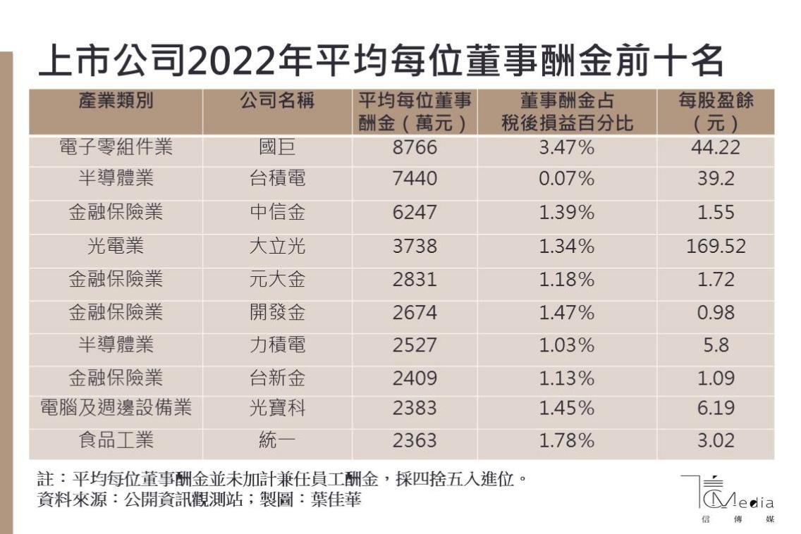檢視上市公司2022年平均每位董監事酬金前十名,除了國巨、台積電、中信金位居前三名之外,大立光則因2022年獲利回春,每股盈餘(EPS)大賺169.52,因而帶動平均董事酬金至3738萬,擠進第4名;第五名則是元大金,平均董事酬金為2831萬元。