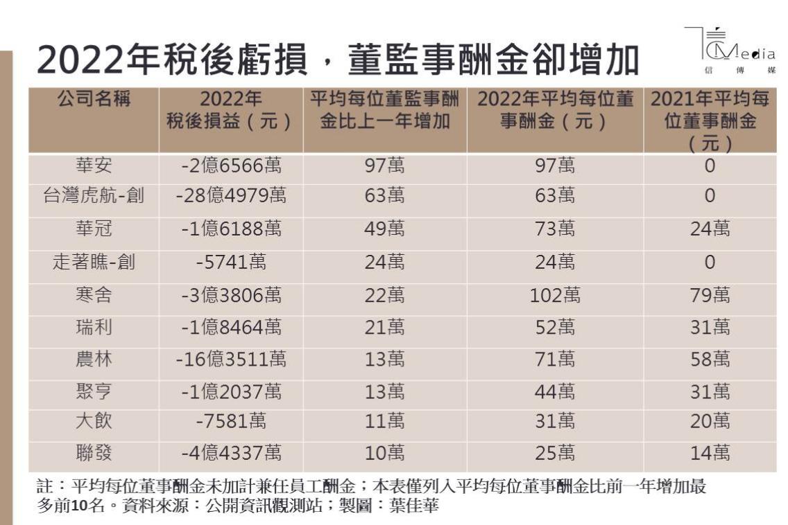 而華冠2022年也同樣虧損約1.62億元,但同一年度平均每位董事酬金仍發出73萬元,比起前一年的24萬元,還多出49萬,成為公司虧損、但年增金額卻達第3高的上市公司。