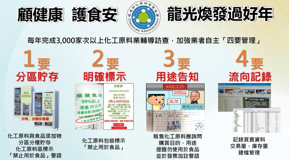 環境部補充,除了公告列管食安風險疑慮化學物質,自106年起每年均與地方政府完成3,000家次以上化工原料業者輔導訪查,加強業者自主管理,避免下游業者將化工原料誤用或濫用於食品。此外於春節期間配合衛生機關之複合式專案稽查,加強查核食安風險疑慮毒性及關注化學物質運作,共同把關防堵流入食品鏈。