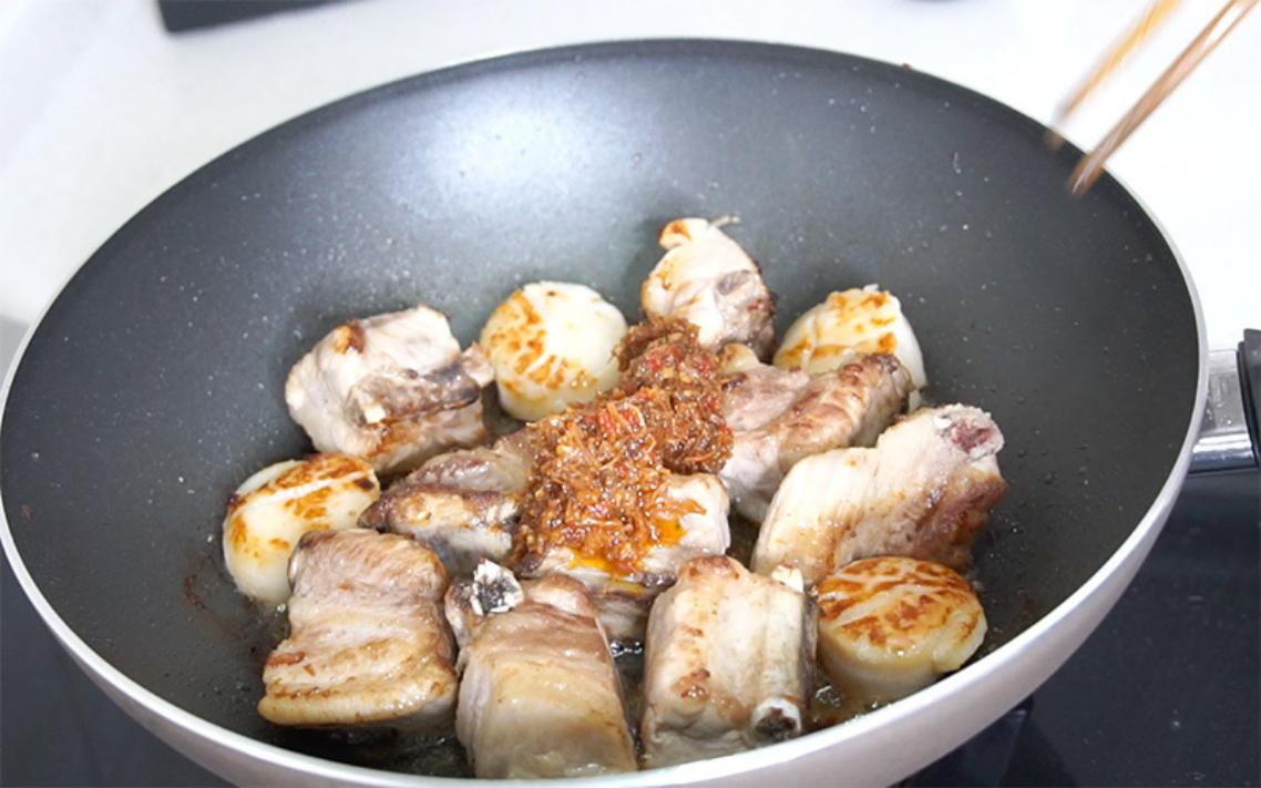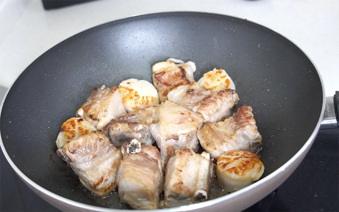 取深炒鍋,加一點油熱鍋後,放入排骨與干貝乾煎上色。