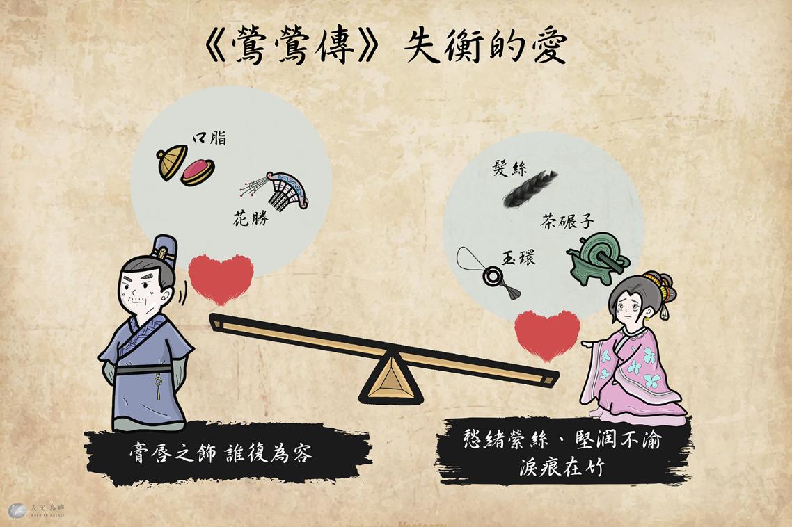 張生的禮物看重鶯鶯的美色,鶯鶯的禮卻有著深刻含義,送上情感、道德的喻託,甚至交上自己生命的一部分,生命之初召喚情感的真純,從送禮便能看見兩人情感不同深度的悲劇意涵。