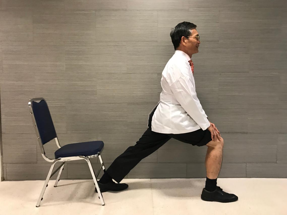 1. 從椅子上站起、坐下循環:可以的話椅子越放越低,低到後來可以蹲下去站起來。「這就是肌力的問題,如果肌力不夠,就會容易跌倒,如果關節不錯就可以蹲下站起。剛開始可以手扶著欄杆或是一個穩定的固定物幫助站起來。」