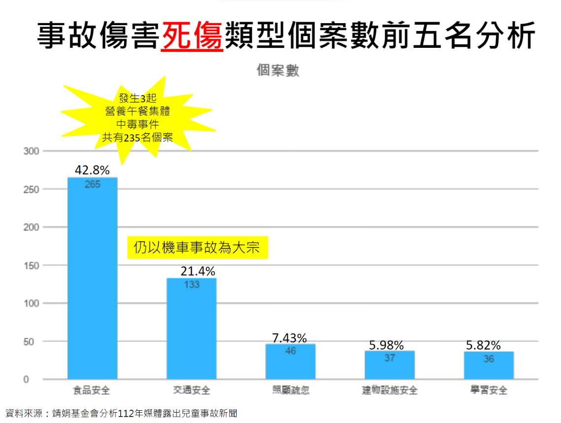 靖娟基金會調查分析樣本是從112年1月至12月媒體上露出之兒童事故新聞,根據統計,112年扣除兒虐、性侵等類別,共發生234件兒童事故新聞,並導致14歲以下兒童38死、581傷,共計619人、年增約3成,許雅荏表示,主要是因為食品安全、交通安全2種類案數增加導致,該2類即占比總死傷人數的6成5。
