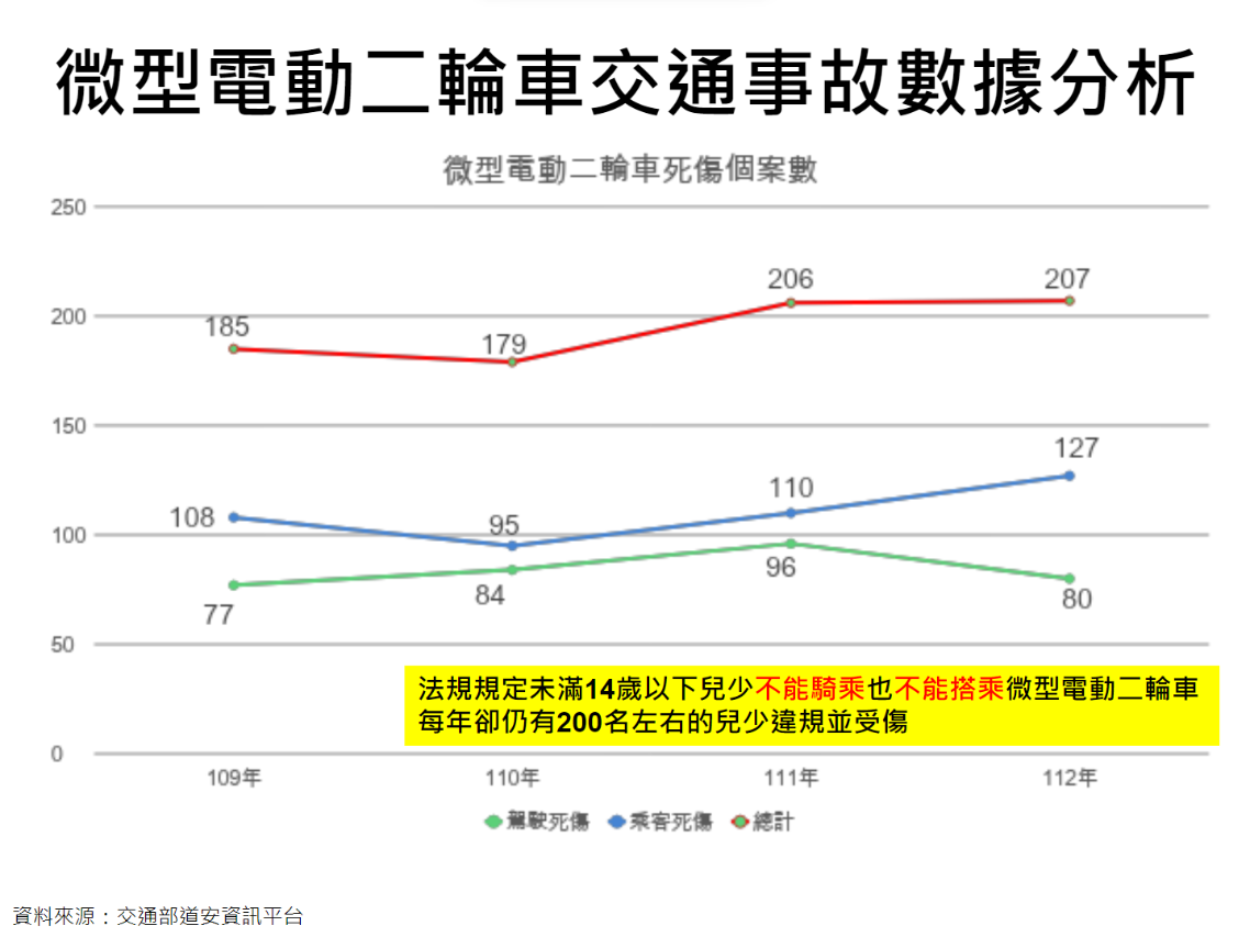 另外,第二大宗的「交通安全」,共佔總死傷人數約2成,118人受傷、15人死亡,其中仍以機車、兒少為附載人的交通事故為大宗;不過,值得注意的是,靖娟進一步對照交通部道安資訊平台數據,發現112年慢車的死傷較109年持續上升,而目前法規規定未滿14歲以下兒少不能騎或搭乘的微型電動二輪車,還都連續4年近200名兒少違規受傷;電動輔助自行車死傷人數則是逐年增長,在112年創下新高,死傷數已在3年內成長2倍。