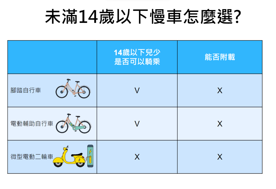許雅荏說明,未滿14歲以下兒少目前可以騎乘的車種,只有腳踏自行車及電動輔助自行車,而微型電動二輪車則是要年滿14歲以後才能騎乘,除電輔可由成人附載幼童外,其他皆不能附載。