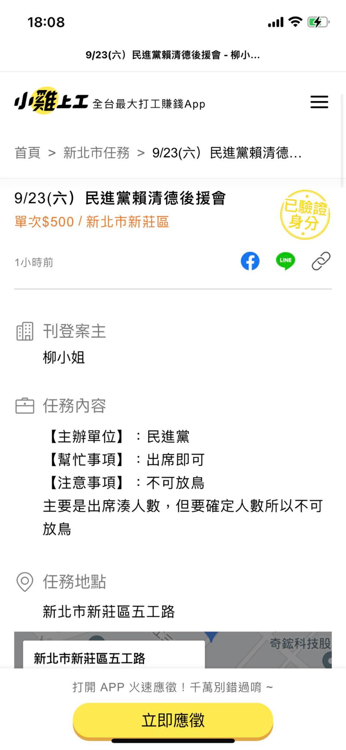 國民黨青年部前主任陳冠安去年9月14日在臉書揭發,有人在「小雞上工」平台貼出徵人資訊,9月23日賴清德後援會新莊造勢時,到場就可領500元,「真的是下去領500!」