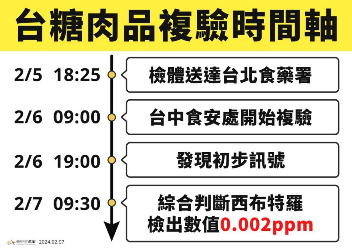 台中市府指出,中市食安處實驗室6日9時依照中央公告檢驗方法啟動複驗,包含中央食藥署3位人員、2位專家委員是台灣大學名譽教授何國榮、中興大學名譽教授李茂榮,台糖公司代表1位,共6位檢視檢驗過程,食安處全程錄影存證。