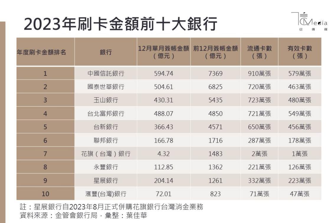 有效卡數最終排名則分別是,中國信託銀行(579萬張)、台北富邦銀行(549萬張)、玉山銀行(480萬張)、國泰世華銀行(463萬張)、台新銀行(456萬張)。