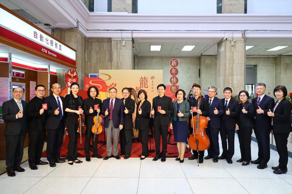 臺灣銀行龍年開工充滿濃濃的文化藝術氛圍,邀請臺灣樂壇深受矚目的音樂家,演奏多首新春曲目,為現場貴賓們獻上新春賀禮,此外,該行呂董事長也特別準備了應景喜氣的橘子和蘋果,親自向現場貴賓表達新年的祝福,祝福大家在新的一年大吉大利、平安喜樂,恩上加恩、力上加力,恩典滿溢,好運龍總來!相信在呂董事長的帶領下,臺銀新的一年將再創佳績,為該行的發展再添新的光彩。