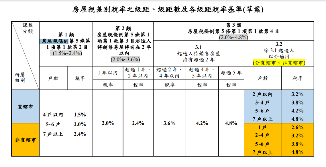 至於出租或繼承共有房屋,全台則共用統一基準,4戶以內稅率1.5%;有5至6戶稅率2.0%;擁有7戶以上稅率則為2.4%。