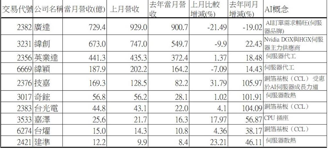 AI伺服器概念股中,其他兩檔1月營收年增率都超過100%個股分別是伺服器散熱的奇鋐和銅箔基板(CCL)的台光電,奇鋐1月營收56.8億元年增率101.9%、台光電為44.8億元,年增率104%。