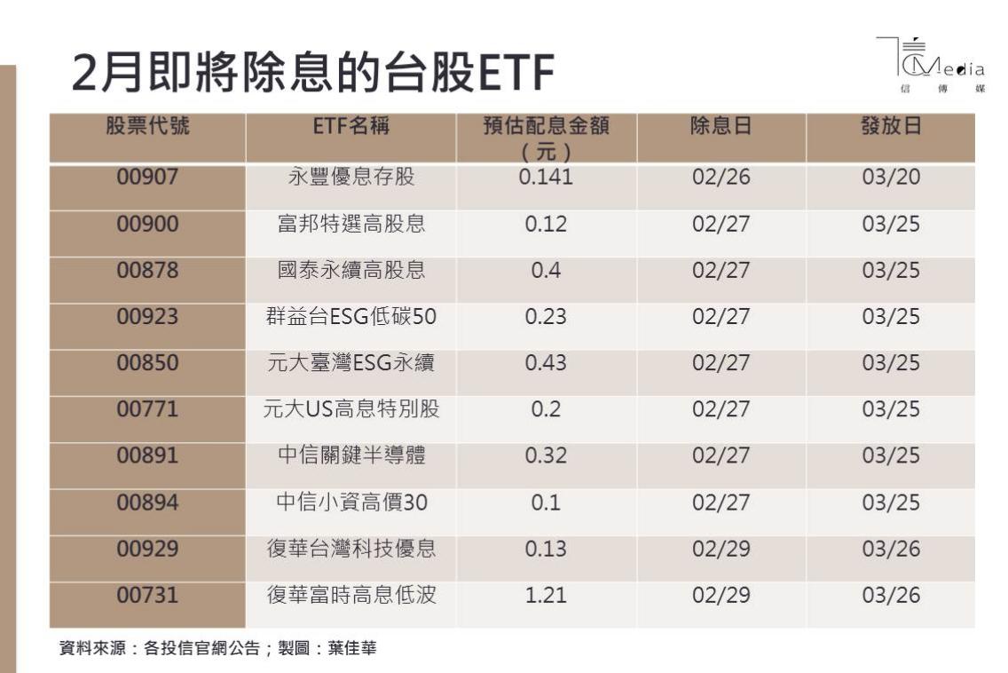 今年2月陸續將展開除息的台股ETF共有10檔,根據除息日時間分別依序有永豐優息存股(00907)、富邦特選高股息(00900)、國泰永續高股息(00878)、群益台ESG低碳50(00923)、元大臺灣ESG永續(00850)、元大US高息特別股(00771)、中信關鍵半導體(00891)、中信小資高價30(00894)、復華台灣科技優息(00929)、復華富時高息低波(00731)。