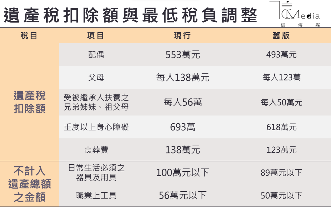 遺產稅扣除額方面,配偶扣除額從原本493萬元提高至553萬元;父母扣除額、喪葬費扣除額從123萬元調高至138萬元;直系血親卑親屬、受被繼承人扶養之兄弟姊妹及祖父母扣除額從50萬元提高至56萬元;重度以上身心障礙特別扣除額從每人618萬元提高至693萬元。