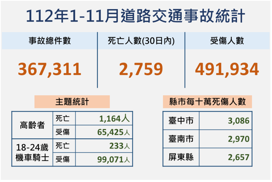⾏⼈零死亡推動聯盟今(22)日召開記者會,聯盟理事林元敏指出,王國材說交通安全已有改善,固可放寬執法,但若攤開去年道安成績,1⾄11⽉的交通死亡⼈數仍⾼達2759⼈,甚⾄交通事故案件數還創歷年同期新⾼,⾼達36萬多件,比前年同期還增加了2萬8897件,「根本慘不忍睹」,對此交通部既無積極政策以改善問題,也不與⺠間進⾏溝通,竟然還要縱容違法⾏為,打算讓1200元以下違規案件不予記點。