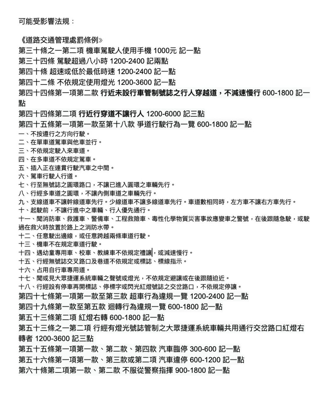 根據《道路安全處罰條例》,1200元(含)以下之違規包含,駕駛中使⽤⼿機、逆向⾏駛、路邊違停、變換⾞道不打燈、爭道、超⾞⋯⋯等。林元寧坦言,「記點是為了淘汰不適任的駕駛」,若連駕駛中使用手機都不用記點,甚至王國材⾃稱最⼤成效的汽機⾞停讓⾏⼈法規(罰款為1200⾄6000元)也可能受影響,非常容易導致台灣好不容易慢慢建立起來的禮讓行人習慣「走回頭路」。