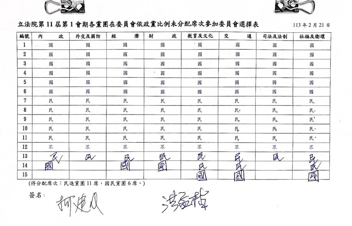 立法院第11屆第1會期8個常設委員會將於29日舉行召委選舉,各黨席次今(22)日出爐,除了民眾黨在各委員會平均配置1席之外,藍綠在8個委員會則是各有千秋。