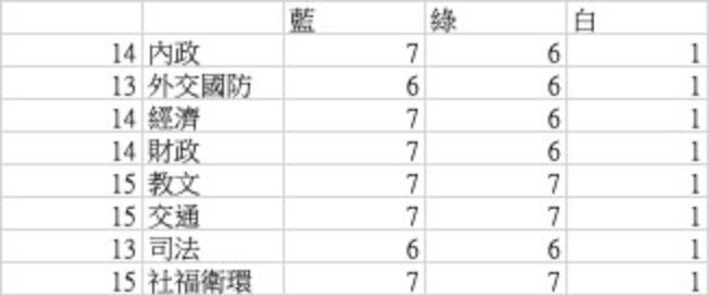 本屆立委國民黨團共54席、民進黨51席、民眾黨8席,今天藍綠協調出8個委員會的席次分配,藍營的部分,在內政、經濟、財政、教文、交通、衛環藍營拿下7席,外交、司法拿下6席。綠營的部分在教文、交通、衛環拿下7席,內政、外交、經濟、財政、司法拿下6席。