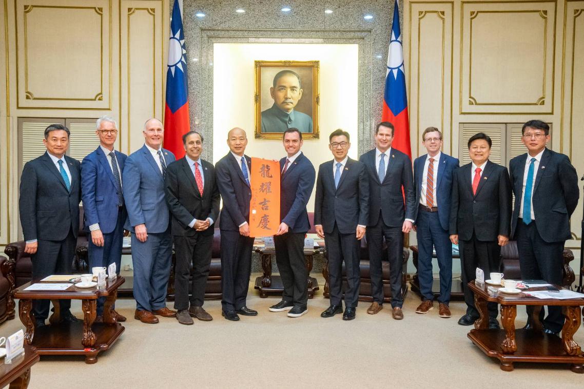 韓國瑜昨天在副院長江啟臣、國民黨團總召傅崐萁、民進黨立委王定宇、民眾黨團總召黃國昌、秘書長周萬來、國際事務處長林晨富以及美國在台協會柯傑民(Jeremy Cornforth)代理處長等人陪同下,接見美國聯邦眾議院「美國與中國共產黨戰略競爭特設委員會」主席蓋拉格(Mike Gallagher)訪團一行。