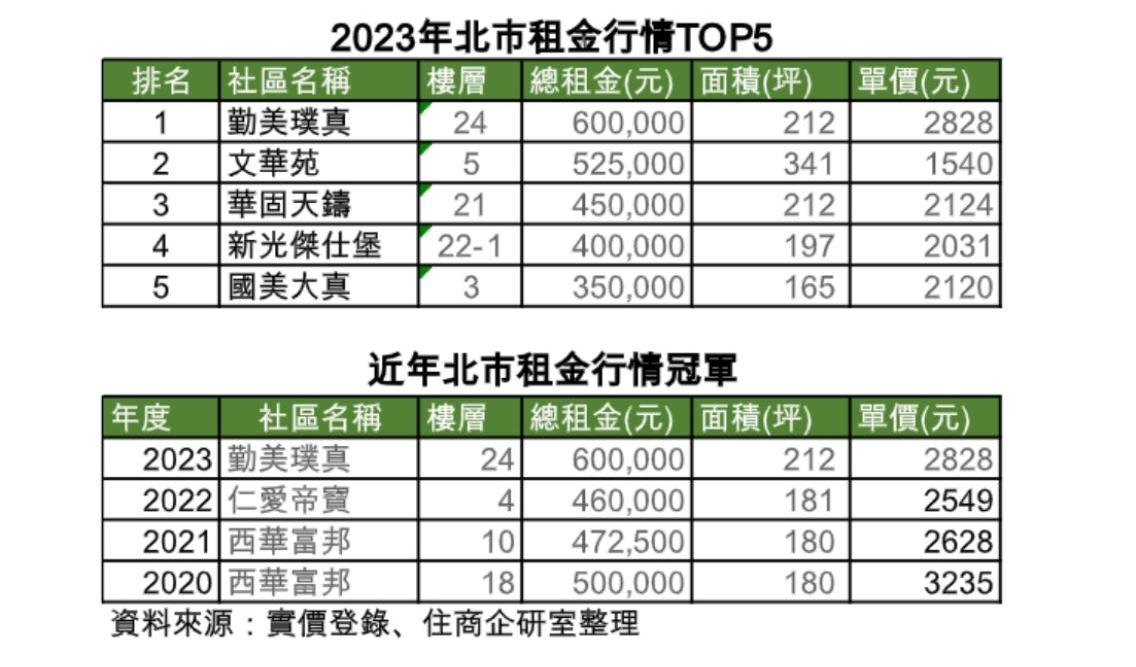 根據北市地政雲2023年資料,勤美璞真以60萬天價租金榮膺租金王,也是近年新高,文華苑以52.5萬租金緊追在後,兩社區皆是屋齡10年以上,位置優越的資深豪宅,住商機構企劃研究室同時也整理近四年北市住宅租金冠軍,發現西華富邦再寫下兩年租金王後,去年由仁愛帝寶奪下冠軍,今年換手由勤美璞真接棒,住商不動產企劃研究室執行總監徐佳馨指出,豪宅因政府重重管制變成票房毒藥,市場近年供給少,但大坪數仍有需求,許多中古豪宅因為地點優越、使用坪數相對大,獲得高端租客青睞。