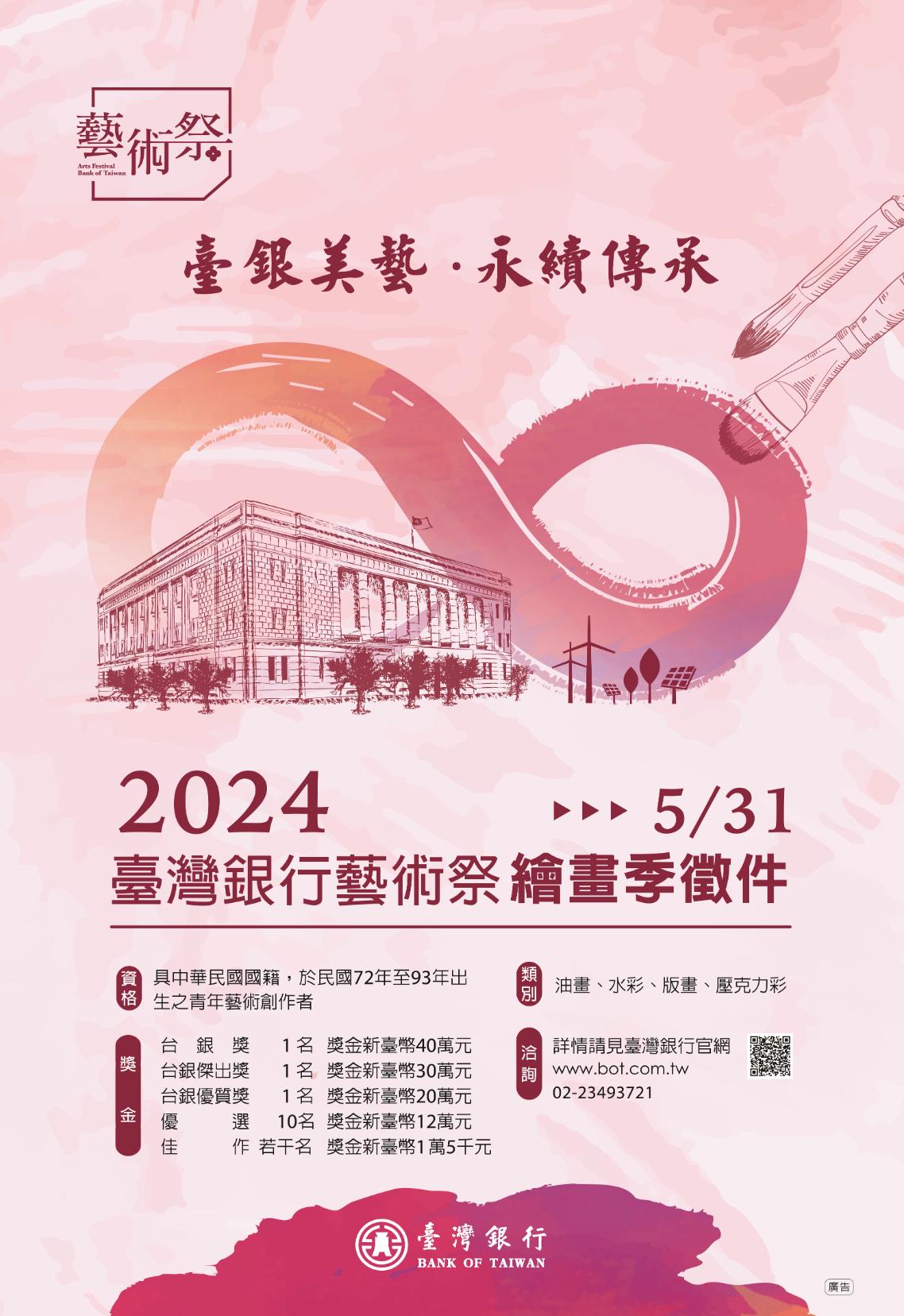 「2024臺灣銀行藝術祭-繪畫季」將於本113年5月2日至5月31日開放報名收件,首獎獎金高達新臺幣40萬元,總獎金逾200萬元,廣邀全國青年藝術創作高手,踴躍報名參賽!