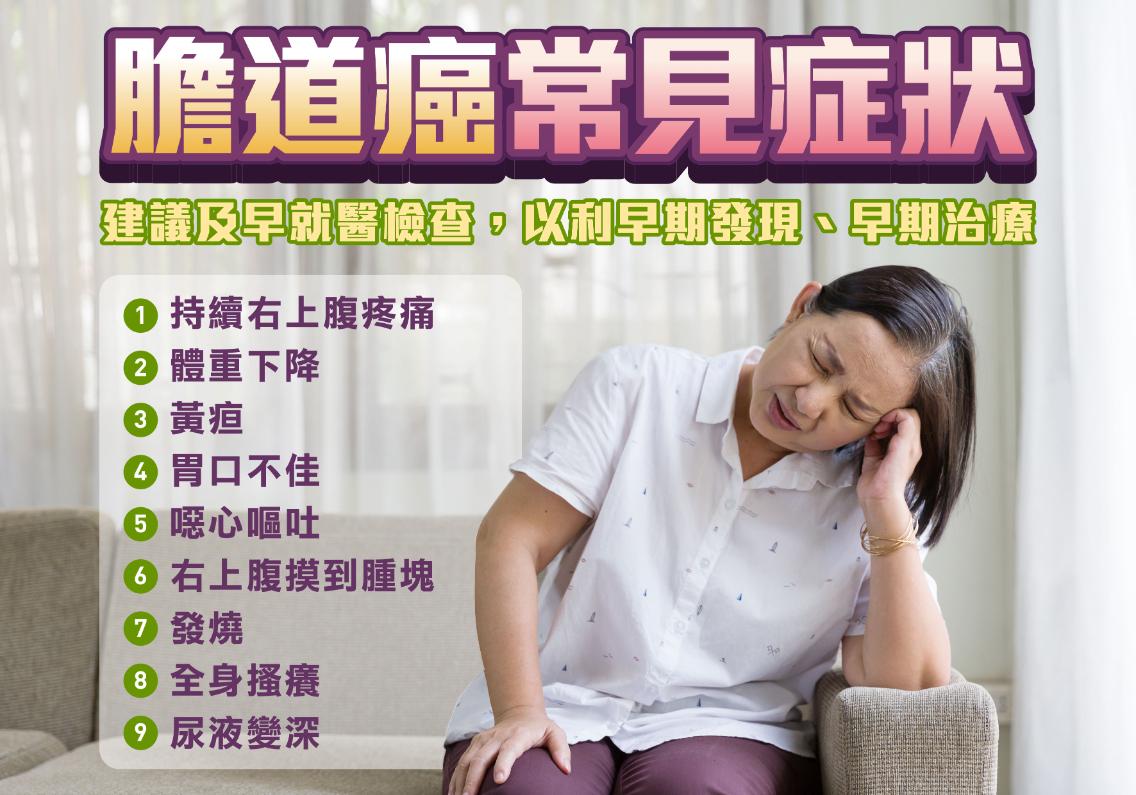 台灣膽管癌患者多數為肝內膽管癌,早期症狀相當不明顯。白禮源醫師說明,膽管癌患者如果腫瘤長在末端膽管匯集之處,比較會因為早期導致黃疸的產生,而被注意。然而,依臨床經驗,有近7成膽道癌患者發現時多已經是晚期,合併局部淋巴結轉移或是遠處器官轉移。膽管癌患者常見的症狀包括黃疸、持續性右上腹疼痛、體重下降、胃口不佳、噁心嘔吐、右上腹摸到腫塊、發燒、全身搔癢、尿液變深等。