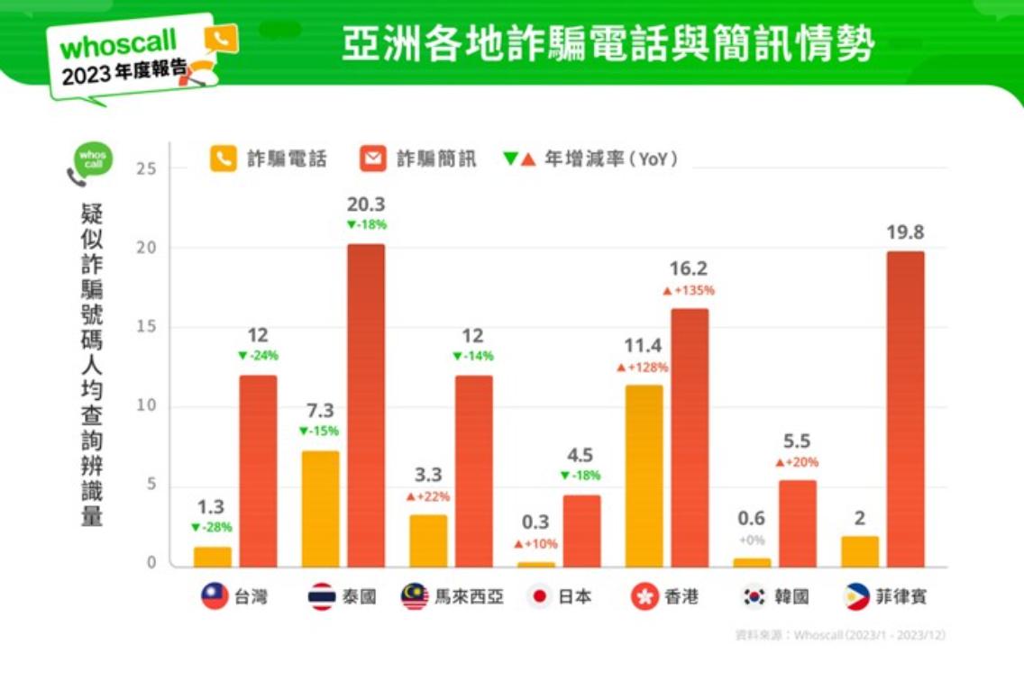 Whoscall公布統計,詐騙情勢在2021年疫情的推波助瀾仍居高不墜,不過整體數量已連兩年下降。檢視亞洲各地的詐騙情勢,在各國政府、業者共同努力與民眾防詐意識抬頭下,多數地區的詐騙量皆有暫時緩和的跡象,僅有香港在啟動電話實名制後,仍抵擋不住詐騙電話與簡訊量皆翻倍增長。