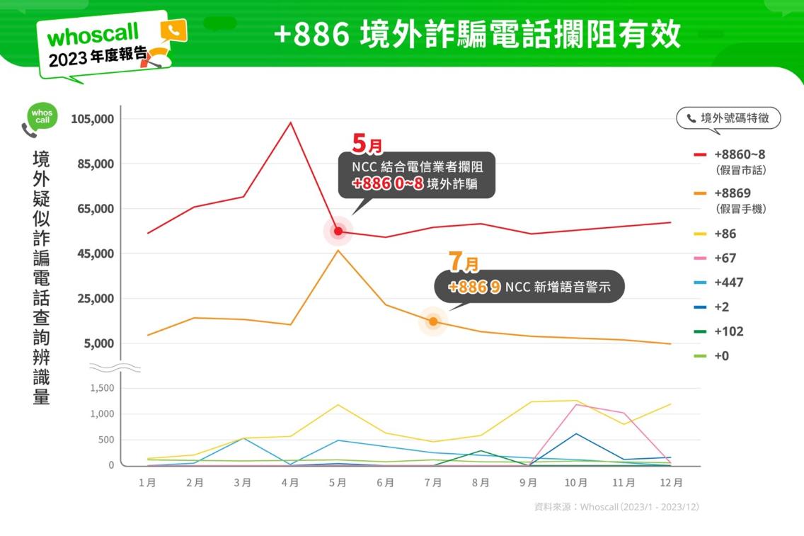 配合「打詐行動綱領1.5版」,國家通訊傳播委員會(下稱NCC)去年聯合電信業者加大力道攔阻境外詐騙電話,自5月起封鎖所有「+886 0至8」開頭的號碼撥入台灣。在取得初步成效後,NCC再針對「+886 9」開頭的境外漫遊號碼的來電,在通話前增設「這是國際電話,請小心詐騙」的語音警示。
