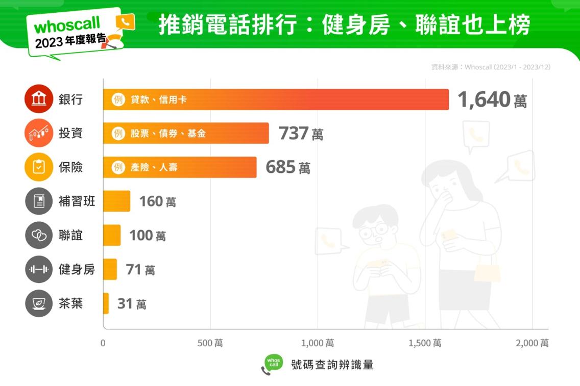 除了防範詐騙之外,Whoscall最受用戶喜愛的原因必然是「過濾無數推銷電話」,提供明確且易理解的來電辨識結果。由於電話行銷仍是多數業務拓展不可或缺的管道之一,Whoscall進一步分析推銷電話種類,仍是「銀行」大幅高出其他種類為居首位,投資(例如:股票、債券、基金等)、保險(例如:產險、人壽等)則為居二、三位。緊接在泛金融產業以後,按推銷電話量依序為補習班(例如:文理補習班、汽車駕訓班等)、單身聯誼(例如:婚友社等)、健身房、茶葉(例如:茶葉試喝等)。由於這類的商家時常在商圈舉辦實體消費者體驗活動(或稱「地推」),由showgirl與教練向民眾發放問卷,又或社群中發放會員註冊換取優惠、試用品,用以搜集聯絡資訊,隨之而來的便是推銷電話與簡訊的最新優惠方案推薦。