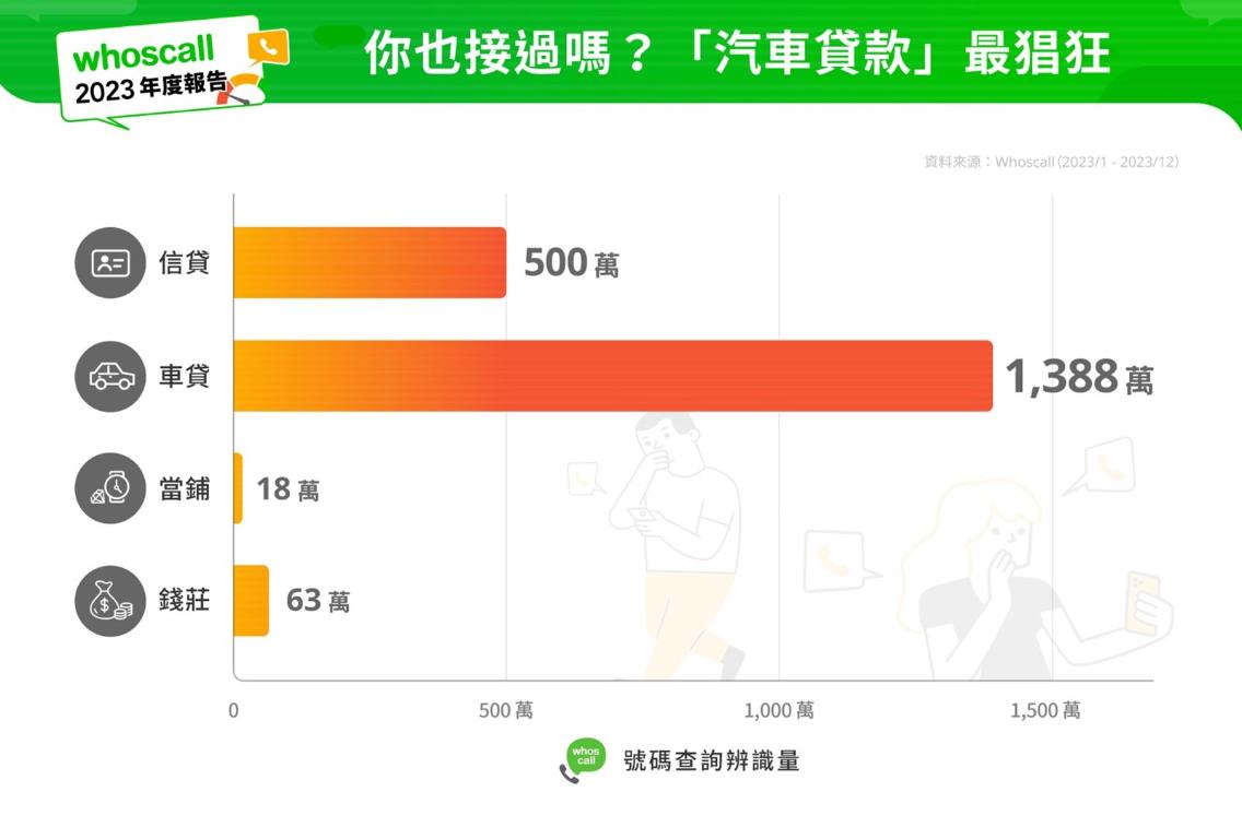 由於借貸類型電話種類多元,Whoscall簡要歸類為信用貸款、汽車貸款、當鋪以及錢莊共四種類別,按照年度號碼辨識量檢視,「汽車貸款」以超過1,388萬次的年度辨識量成為最頻繁來電的業者,而「信用貸款」多以銀行為主,也累積500萬以上的辨識量,「錢莊」、「當鋪」也各皆有63萬、18萬次以上的辨識量。反映用戶偏好、避免其受打擾,在《Whoscall進階版》自動封鎖功能中每週更新的上萬筆騷擾號碼清單內,平均有高達4成的號碼與借貸有關。