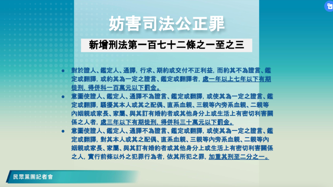 針對妨害司法公正罪,黃國昌指出若有人試圖透過賄賂、騷擾、犯罪行為等,使得證人不願意出庭作證,或是出庭時為一定之證言,這是嚴重傷害公平正義。