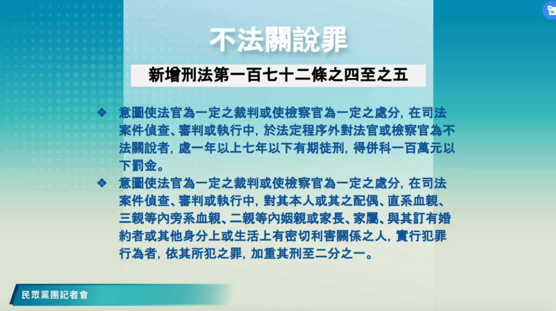 至於不法關說罪,黃國昌說意圖使法官為一定之判決,或使檢察官為一定之處分,於法定程序外對法官和檢察官進行不法關說者,有必要課予刑事處罰。