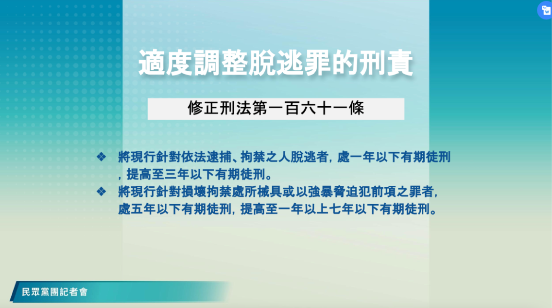 對此,黃國昌認為應研議妨害司法公正罪與棄保潛逃罪,而且蔡英文總統在2017年召開的司改國是會議就曾促成會議結論,「此時此刻已經是2024年,請問七年過去,蔡英文政府給人民的承諾到底在哪裡?我們問了非常多次,永遠得到的答案就是不斷推拖」。