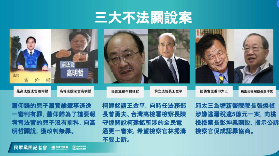 第二,黃國昌指出民進黨團總召柯建銘請前立法院長王金平,向時任法務部長曾勇夫、台灣高檢署檢察長陳守煌,關說柯建銘所涉的全民電通更一審案,希望檢察官林秀濤不要上訴,而且案子結束後,關說的人通通都沒有事。