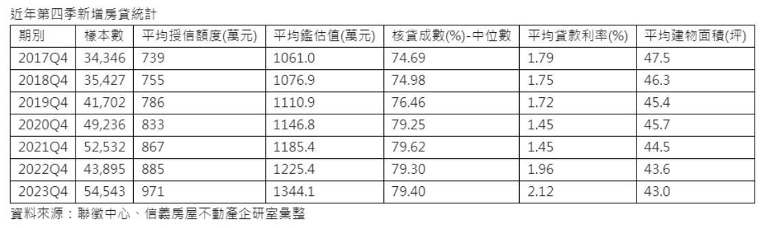 根據聯徵中心最新資料顯示,去年第四季國人申請房貸統計,平均購屋總價達1344萬元,房價再創歷史新高,平均貸款金額970.5萬元也同步寫下新高,不過購屋面積卻是追平歷史新低的43坪,購屋的核貸成數中位數達79.4%,顯示過半民眾的房貸成數已經超過79%,貸款8成已經是普遍的現象。