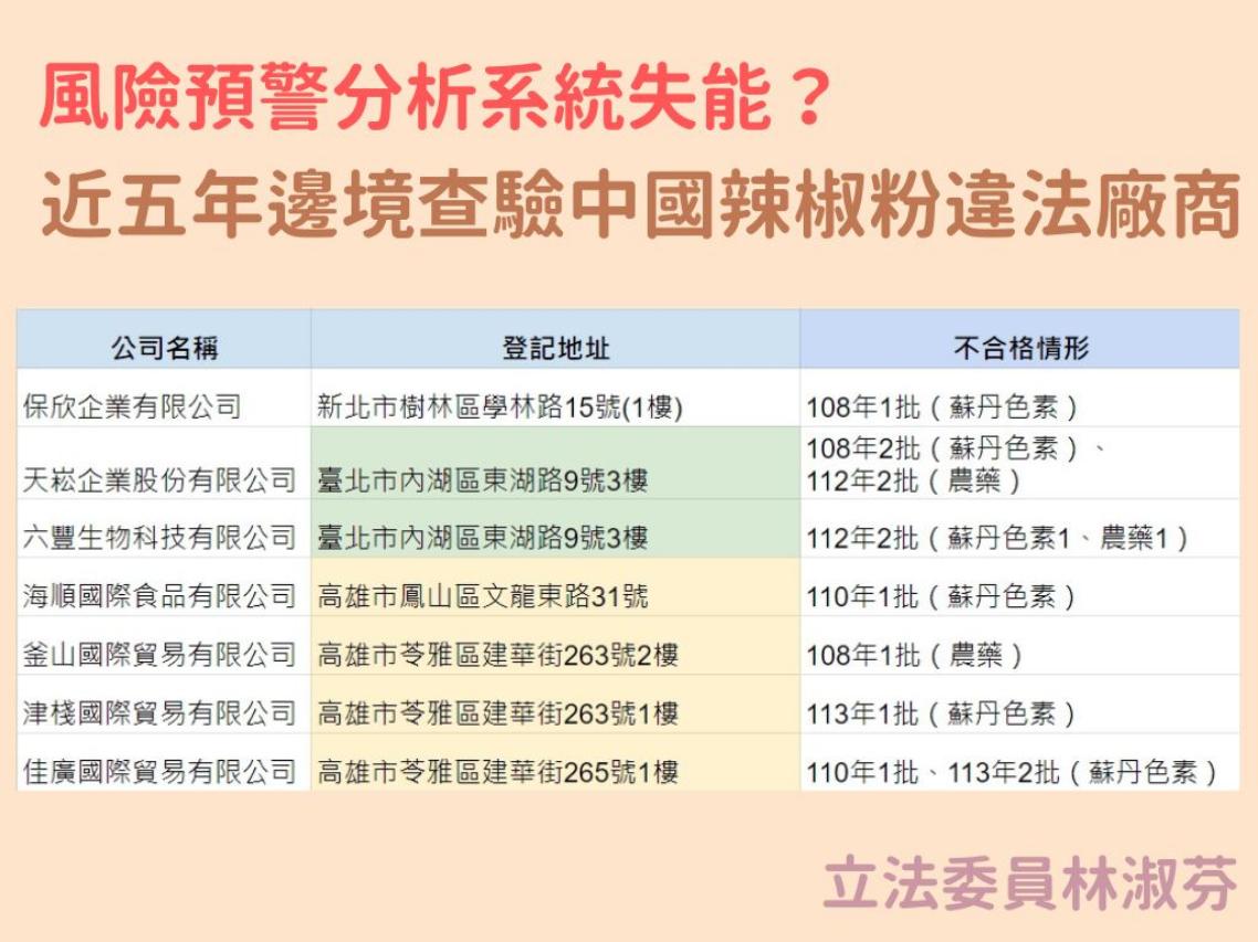 她更揭露,近年查獲違法辣椒粉的廠商海順公司、釜山公司、津棧公司和佳廣公司,全都是同個家族的公司,「不是登記地址相同,就是負責人一樣,而六豐生物公司、綠風實業公司看似沒關聯,實際去查也發現互為股東、公司都有相通,甚至林淑芬辦公室使用中國國家企業信息系統,竟發現津棧公司與佳廣公司,從中國輸入辣椒粉的來源廠「Kevin Shipping」根本不存在,而用Google查詢後,竟發現Kevin Shipping是間香港船務公司,「一家不曉得在做什麼也不知道是否真有這間公司,禁了個虛無飄渺的公司,但它還可以再換個名字。」