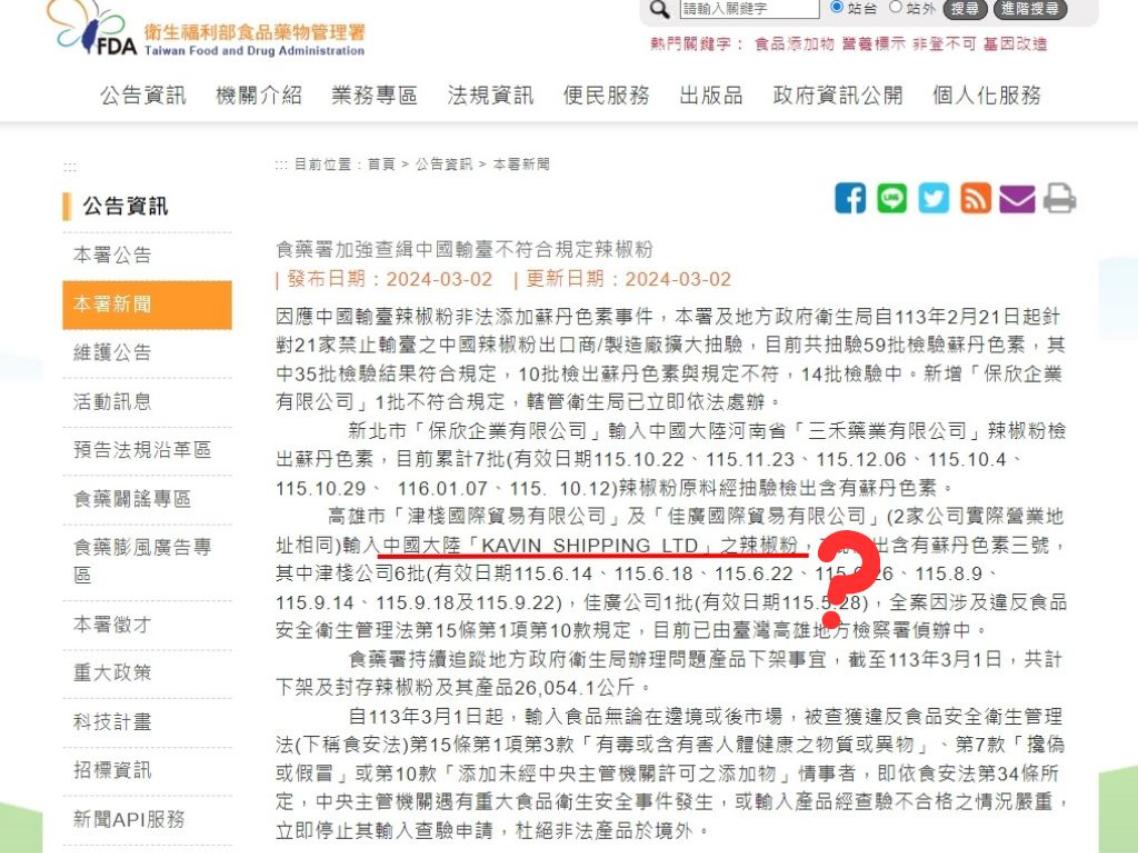 林旭揚表示,食藥署自113年3月5日起於署官網首頁設置「辣椒粉檢出蘇丹色素不合格專區」,揭露「違規業者」、「不合格原料報驗案號(效期)」、「檢驗結果日期」、「原料及其相關產品下架回收及封存總量(公斤)」、「使用保欣公司不符合原料下游業者名單、產品名稱及相關資訊」、「使用津棧/佳廣公司不符合原料之下游業者名單、產品名稱及相關資訊」等資訊,供外界參考,以達資訊透明化。