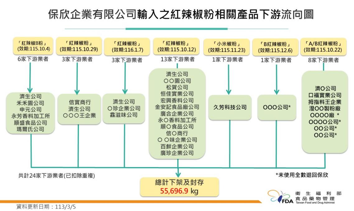 食藥署6日指出,新北市「保欣企業有限公司」輸入中國大陸河南省「三禾藥業有限公司」辣椒粉檢出蘇丹色素,目前累計7批(有效日期115.10.22、115.11.23、115.12.6、115.10.4、115.10.29、 116.1.7、115.10.12)辣椒粉原料經抽驗檢出含有蘇丹色素,全案目前由台灣新北地方檢察署偵辦中。