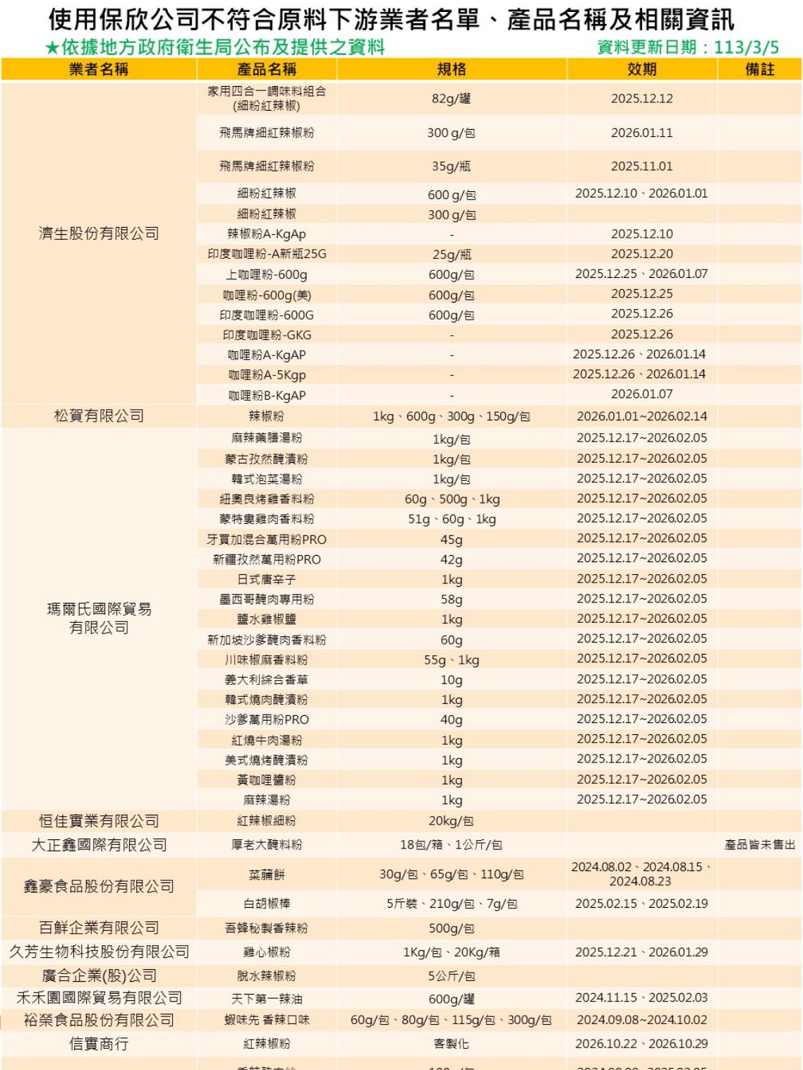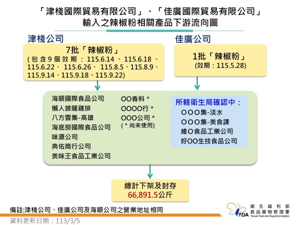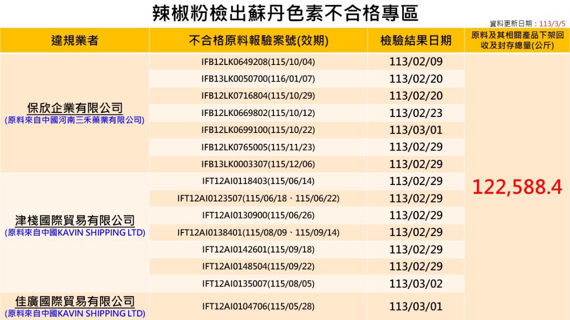 另外,高雄市「津棧國際貿易有限公司」及「佳廣國際貿易有限公司」(2家公司實際營業地址相同)輸入中國「KAVIN SHIPPING LTD」之辣椒粉,8批檢出含有蘇丹色素,其中津棧公司7批(包含9個效期:115.6.14、115.6.18、115.6.22、115.6.26、115.8.5、115.8.9、115.9.14、115.9.18及115.9.22),佳廣公司1批(有效日期115.5.28)。全案目前已由台灣高雄地方檢察署偵辦中。