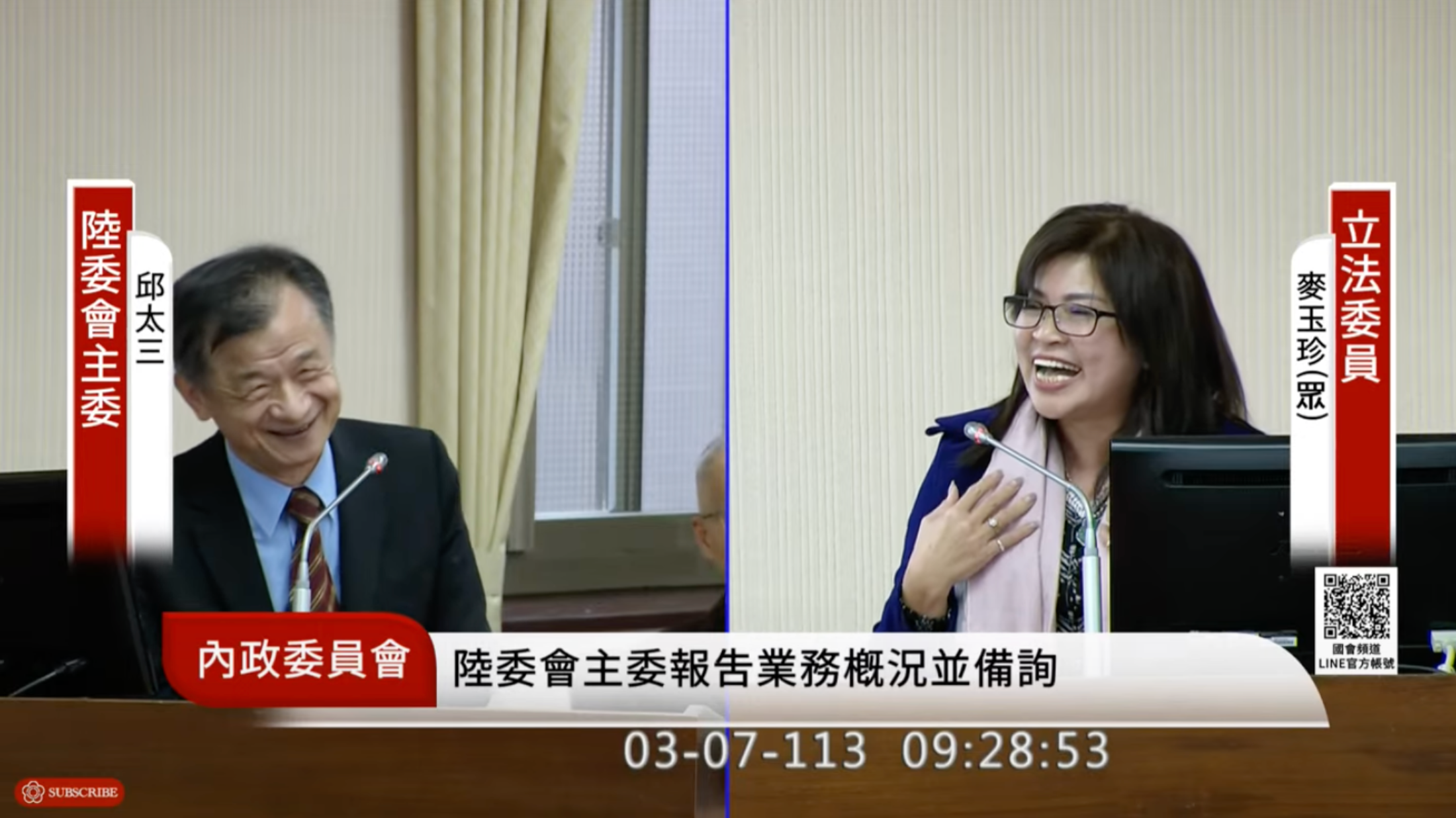 立法院第11屆第1會期內政委員會今(7)日召開第4次全體委員會議,邀請大陸委員會主任委員及財團法人海峽交流基金會董事長列席報告業務概況,並備質詢。雖然台灣民眾黨立委麥玉珍對邱太三的質詢過程相當融洽,不像同黨黃國昌般的激烈,現場還出現歡笑聲,背後卻是凸顯出中國籍配偶和其他外籍配偶在權利和福利上的不平等。