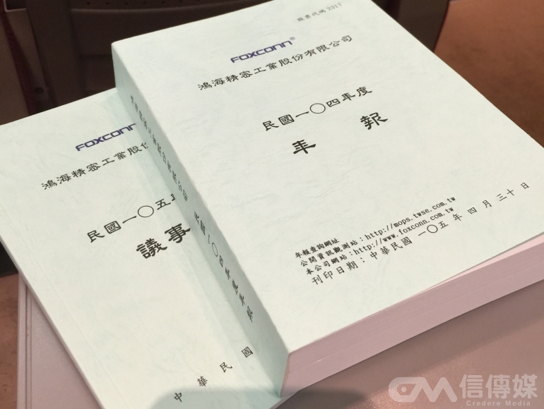 從這本比英文字典還厚的年報,可以看出鴻海帝國事業真的很龐大。(攝影/張瀞文)