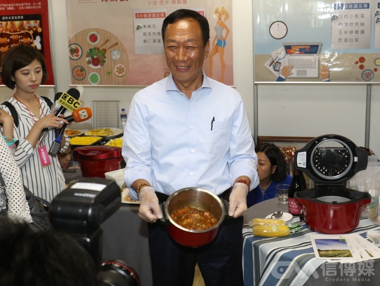 由於入主了日本夏普,今年鴻海股東會很不一樣,股東會現場猶如日系夏普家電產品展示會現場,董事長郭台銘不僅喊出「鴻海不到200絕不退休」,現場也賣力又吃又煮親自當起自家產品的代言人,現場好不熱鬧。