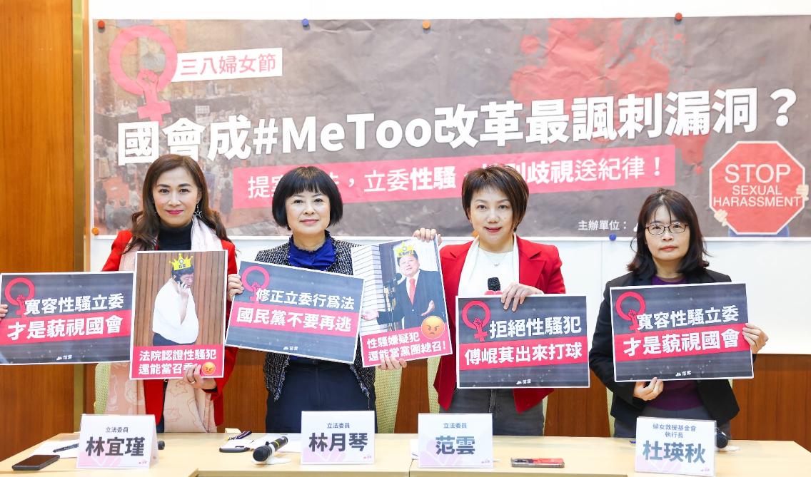 民進黨團今日也召開記者會,稱#MeToo運動後促成的性平三法修正今日正式施行,但負責立法的國會殿堂,卻有首位被法院認證的性騷立委陳雪生、曾被知名女性媒體人指控抱頭強吻的立委傅崐萁,抨擊他們不僅能被國民黨提名參選,更成為國民黨團總召與委員會召委,直言非常諷刺。
