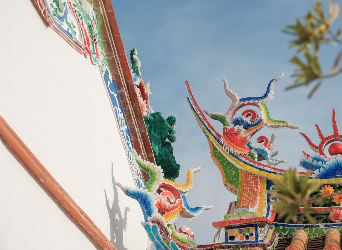 如果讀者有機會走近廟宇,就會發現許多宮廟屋頂上都有鑲嵌式的浮雕和塑像,多數為寶塔、青龍、飛鳳、神仙、花鳥蟲魚……等造型,將廟頂裝飾點綴的五彩繽紛,熱鬧非常。這些作品就是剪黏與泥塑工藝造就成的。剪黏做為傳統建築的一種裝飾技術,主要用在寺廟或華屋大宅的屋頂主脊或水車堵上。所用材料為裁剪過的陶瓷片或玻璃片,早年利用石灰、海菜粉或糯米、黑糖等調製而成的黏劑沾黏成需要的造型,剪黏也就是「先剪後黏」的意思。