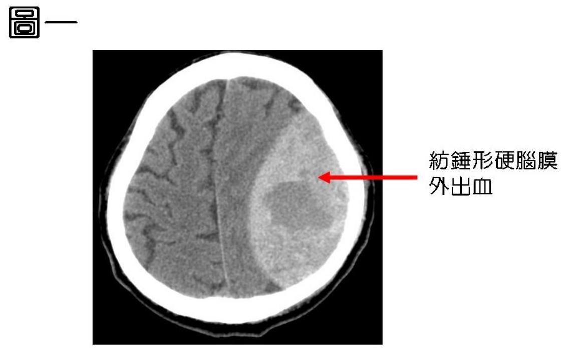 張啟文也提到,硬腦膜外出血的症狀和出血的位置及出血量有關係,可以是沒有明顯症狀,或是頭痛、嘔吐,或一側癱瘓,更嚴重 的是意識不清、昏迷,甚至死亡。而硬腦膜外出血的診斷主要是透過頭部的電腦斷層掃描(CT),紡錘型的高密度區塊就是硬腦膜外出血,如(圖一)。
