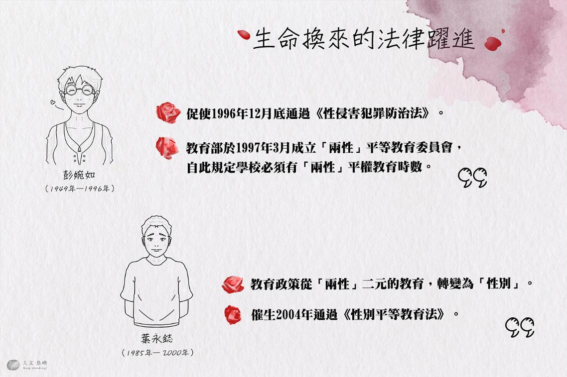 葉永鋕不幸離開,加速了《性別平等教育法》通過,也成為中華民國史上第一部,不以異性戀男、女二元的「兩性」,而以「性別」來命名的法律,悄悄提醒著人們「性別」不只有兩種而已。