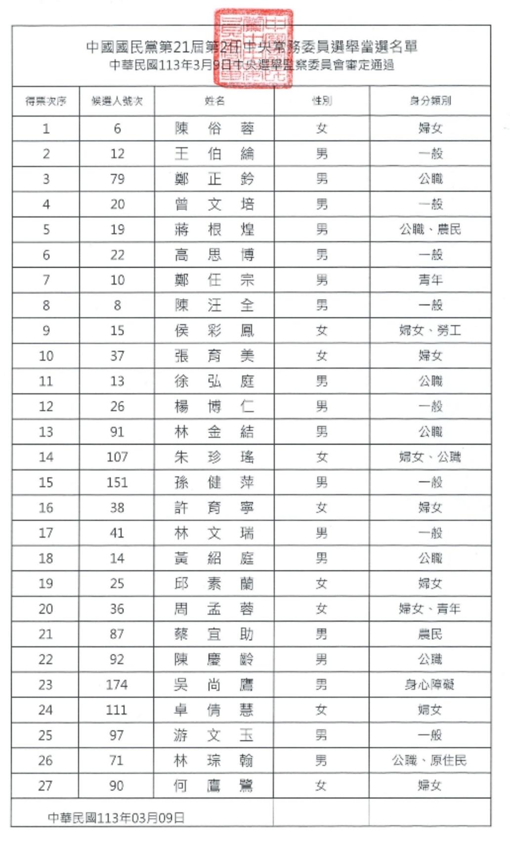 國民黨中常委於9日進行改選,除去6至11席由黨主席任命的指定中常委之外,其餘29席由全體黨代表從中央委員中選出。