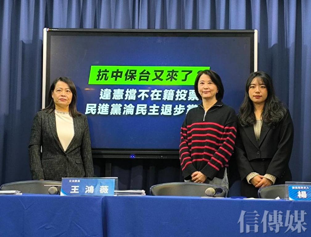 國民黨中央黨部今(12)日亦召開「抗中保台又來了?違憲擋不在籍投票,民進黨淪民主退步黨」記者會,立委許宇甄、王鴻薇,發言人楊智伃提供火力支援。